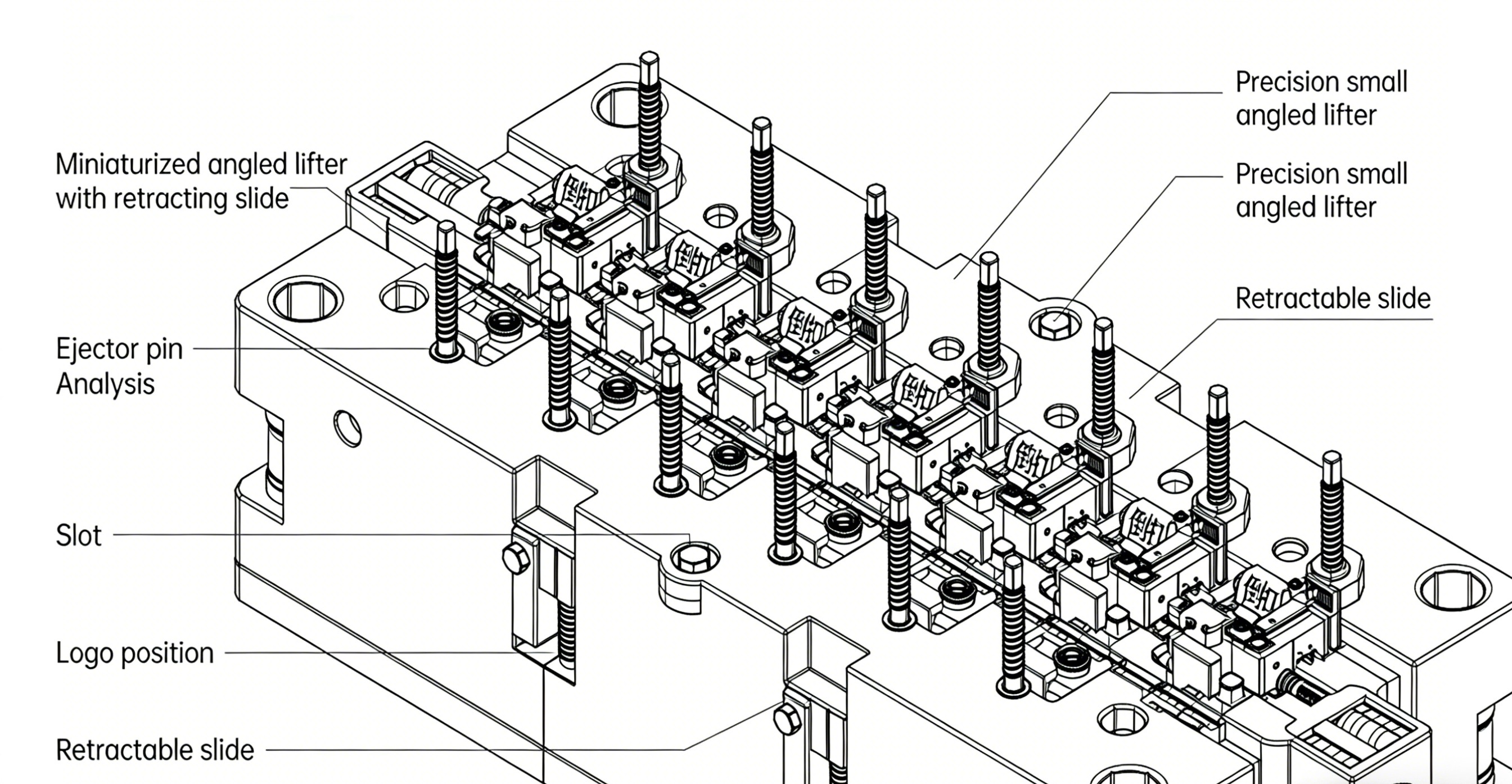 과제: 내부에는 조밀하게 포장된 배터리 수납부 래치, PCB 위치 지정 핀 및 장식용 슬롯 메커니즘이 있어 탈형 중에 플래시 마크, 변형 또는 긁힘이 발생하기 쉬운 복잡한 구조를 만듭니다. 해결책: "다중 그룹 마이크로 테이퍼 이젝터와 접이식 슬라이더" 조합 메커니즘을 설계합니다. 소형 정밀 마이크로 테이퍼 이젝터는 조밀한 내부 언더컷과 리브를 처리합니다. 측면 슬롯이나 로고 위치의 경우 접이식 슬라이드가 제품 손상 없이 원활하게 배출되도록 보장합니다. 이젝터 핀 레이아웃은 응력 분석을 거쳐 부드럽고 균형 잡힌 배출을 보장합니다.